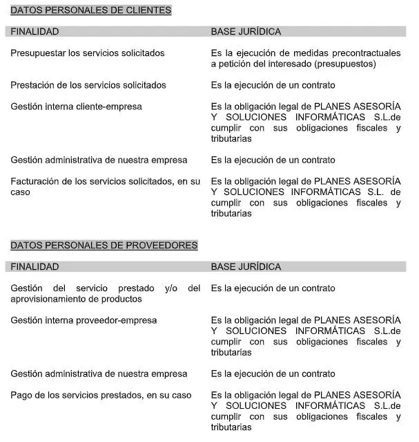 Además, PLANES ASESORÍA Y SOLUCIONES INFORMÁTICAS S.L. puede compartir datos personales con empresa externas, las cuales son responsables, con el fin de poder desarrollar correctamente la actividad. A modo enunciativo y sin carácter exhaustivo, estas empresas podrán ser: